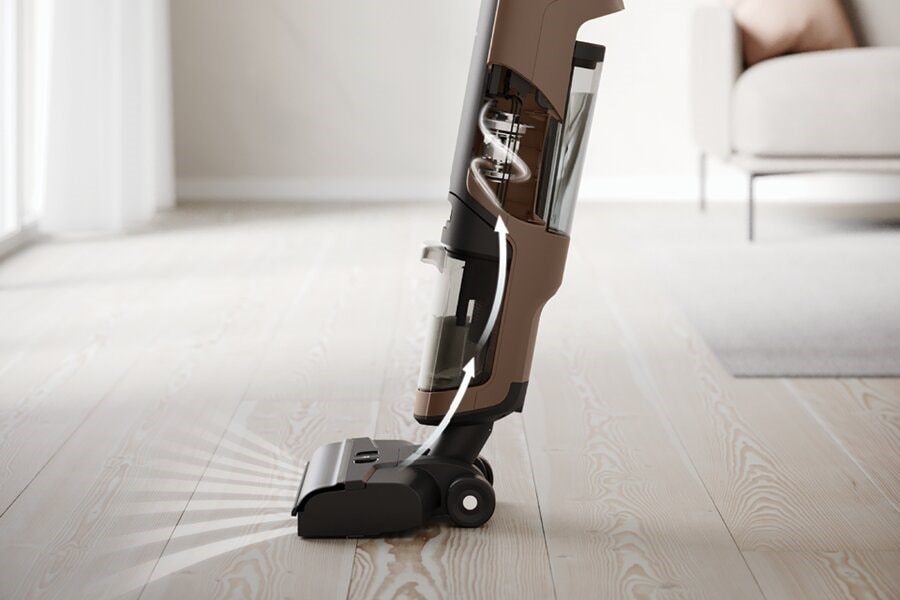 Press. Roll. Clean. Brush roll maintenance is that simple. Taking only two minutes, the self-cleaning function is activated via a button on the hand unit when placed on the charging stand. As the brush roll rotates, clean water is released while suction simultaneously removes dirty water. The result? A thoroughly clean brush roll without getting your hands dirty.
